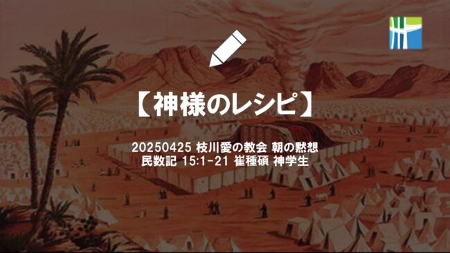 民数記 15:1-21 15:1 主はモーセにこう告げられた。 15:2 「イスラエルの子らに告げよ。わたしがあなたがたに与えて住まわせる地にあなたがたが入り、 15:3 食物のささげ物を主に献げるとき、すなわち、特別な誓願を果たすためであれ、進んで献げるものとしてであれ、例祭としてであれ、牛か羊の群れから全焼のささげ物かいけにえをもって、主に芳ばしい香りを献げるとき、 15:4 そのささげ物をする者は、穀物のささげ物として、油四分の一ヒンを混ぜた小麦粉十分の一エパを、主に献げなければならない。 15:5 また全焼のささげ物、またはいけにえに添えて、子羊一匹のための注ぎのささげ物として、四分の一ヒンのぶどう酒を献げなければならない。 15:6 雄羊の場合には、穀物のささげ物として、油三分の一ヒンを混ぜた小麦粉十分の二エパを献げ、 15:7 さらに注ぎのささげ物として、ぶどう酒三分の一ヒンを献げなければならない。これは、主への芳ばしい香りである。 15:8 また、あなたが特別な誓願を果たすために、若い牛を全焼のささげ物、もしくはいけにえとする場合、あるいは交わりのいけにえとして主に献げる場合は、 15:9 その若い牛に添えて、油二分の一ヒンを混ぜた小麦粉十分の三エパの穀物のささげ物を献げ、 15:10 また注ぎのささげ物として、ぶどう酒二分の一ヒンを献げなければならない。これは主への食物のささげ物、芳ばしい香りである。 15:11 牛一頭、雄羊一匹、いかなる羊、やぎについても、このようにしなければならない。 15:12 あなたがたが献げる数に応じて、それらの数にしたがって、一頭、一匹ごとにこのようにしなければならない。 15:13 すべてこの国に生まれた者が、主への芳ばしい香りの、食物のささげ物を献げるには、このようにこれらのことを行わなければならない。 15:14 また、あなたがたのところに寄留している者、あるいは、あなたがたのうちに代々住んでいる者が、主への芳ばしい香りである、食物のささげ物を献げる場合には、あなたがたがするようにその人もしなければならない。 15:15 一つの集会として、掟はあなたがたにも、寄留している者にも同一であり、代々にわたる永遠の掟である。主の前には、あなたがたも寄留者も同じである。 15:16 あなたがたにも、あなたがたのところに寄留している者にも、同一のおしえ、同一のさばきが適用されなければならない。」 15:17 主はモーセにこう告げられた。 15:18 「イスラエルの子らに告げよ。わたしがあなたがたを導き入れようとする地にあなたがたが入り、 15:19 その地のパンを食べるようになったら、あなたがたは主に奉納物を献げなければならない。 15:20 初物の麦粉で作った輪形パンを奉納物として献げ、打ち場からの奉納物として献げなければならない。 15:21 初物の麦粉のうちから、あなたがたは代々にわたり、主に奉納物を献げなければならない。 料理を作るとき、特にベーカリーの分野では、計量とレシピが非常に重要です。少しでもレシピと違うと、味が大きく変わってしまったり、最悪の場合、まともに食べられない結果物ができてしまうこともあります。だからこそ、私たちはその料理を食べて喜んでくれる人たちを思い浮かべながら、心を込めて丁寧に作るのです。 今日の箇所では、神様がご自身にささげるいけにえの「レシピ」を教えてくださっています。そしてそのレシピ通りにささげられたささげものを、「芳ばしい香り」と表現されています。他の言い方にすれば、「喜ばしいもの」とも訳せます。 神様はご自身の民に、神様を喜ばせる方法を教えてくださったのです。イスラエルの民はこのレシピを通して、神様を喜ばせる礼拝、神様にとって芳ばしいささげものを捧げることができました。彼らのささげものは、自分たちのためのものではありませんでした。神様のためのものであり、神様を喜ばせるためのものであり、同時にそれが彼ら自身にとっても良いものだと知っていました。 このようなレシピは、旧約時代のイスラエルの民だけでなく、私たちにも与えられています。神様は、神様が喜ばれる礼拝の「レシピ」を私たちにも教えてくださいました。私たちはそのレシピに従って、神様を喜ばせる礼拝を捧げなければならないのです。なぜなら、礼拝の中心は、私たちではなく、神様であるからです。 また、神様を喜ばせる礼拝を、日曜日に、教会で行われる礼拝だけとして理解してはいけません。神様は、私たちのすべての日常が、神様にささげられる芳ばしいささげものであると言われました。私たちは毎瞬間、神様を喜ばせるための礼拝を捧げているのです。 食べる人のことを考えず、自分だけを考えて作った料理には、心が込められていません。しかし、食べる人のことを心から思って作る料理には、自然と心が込められ、その気持ちが料理に現れます。それと同じように、私たちの礼拝もそうです。 もし礼拝が「自分のための時間」になってしまうのなら、その礼拝に